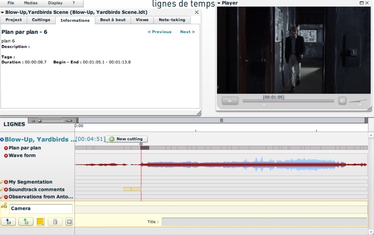 In recent years, Bellour’s ideas to a large extent provided the fundament for the brilliant scholarly video annotation software Lignes de Temps, developed by the Pompidou Centre’s Institut de recherche et d’innovation. Unfortunately, this software is no longer being updated.
