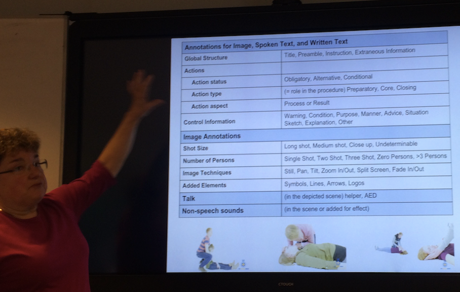 Prof. Gisela Redeker, concluding the first part of the workshop, devoted her presentation to the practical use of video annotation tools for the description and evaluation of multimodal instructions deployed in educational first-aid videos. This project, which is part of the PAT Work Bench project (PI Ielka van der Sluis), uses the ELAN software package, which enables highly precise, multi-tier annotations of the video data under scrutiny.