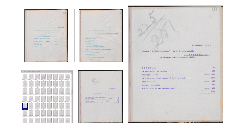 I had been familiar with Desmet and his importance for Dutch film exhibition and distribution, but in order to find my way through the enormous collections, I started with rereading Ivo Blom’s dissertation * Pionierswerk. Jean Desmet en de vroege Nederlandse filmhandel en bioscoopexploitatie (1907-1916) (University of Amsterdam, 2000) and his monograph based on this dissertation, Jean Desmet and the Early Dutch Film Trade (Amsterdam University Press, 2003), which both draw extensively on the documents contained in Desmet’s business archive. Additional documents that were very valuable and helped me navigate through the sheer endless digital pile of images were a detailed inventory made by Eye’s collection specialist for personal and business archives, Piet Dierkx, as well as former reports and papers Christian had written before. Amongst the latter were reports for the NWO KIEM project Data-driven Film History: A Demonstrator of EYE’s Jean Desmet Collection (2014-2015), that aimed at understanding the usefulness of the data available on the Desmet Collection for research on film distribution and exhibition.