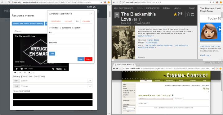 The added value of an environment as the Media Suite is of course that, except from offering access to the collections and the possibility of searching within and across different collections, (segments of) the archived material can be linked and annotated and subsequently shared with other researchers. In case of The Blacksmith’s Love , information in the documents about for example, Desmet or the film’s production and circulation details can be classified using thesauri like GTAA or DBpedia, or linked to databases such as the International Movie Database or Cinema Context . Classifications and links thus potentially serve purposes of data enrichment and Linked Data. In addition, the possibility of sharing research notes and results as provided by the Media Suite, not only resonates with current trends in research practices in the humanities towards interdisciplinary collaboration, but also strongly encourages it.
